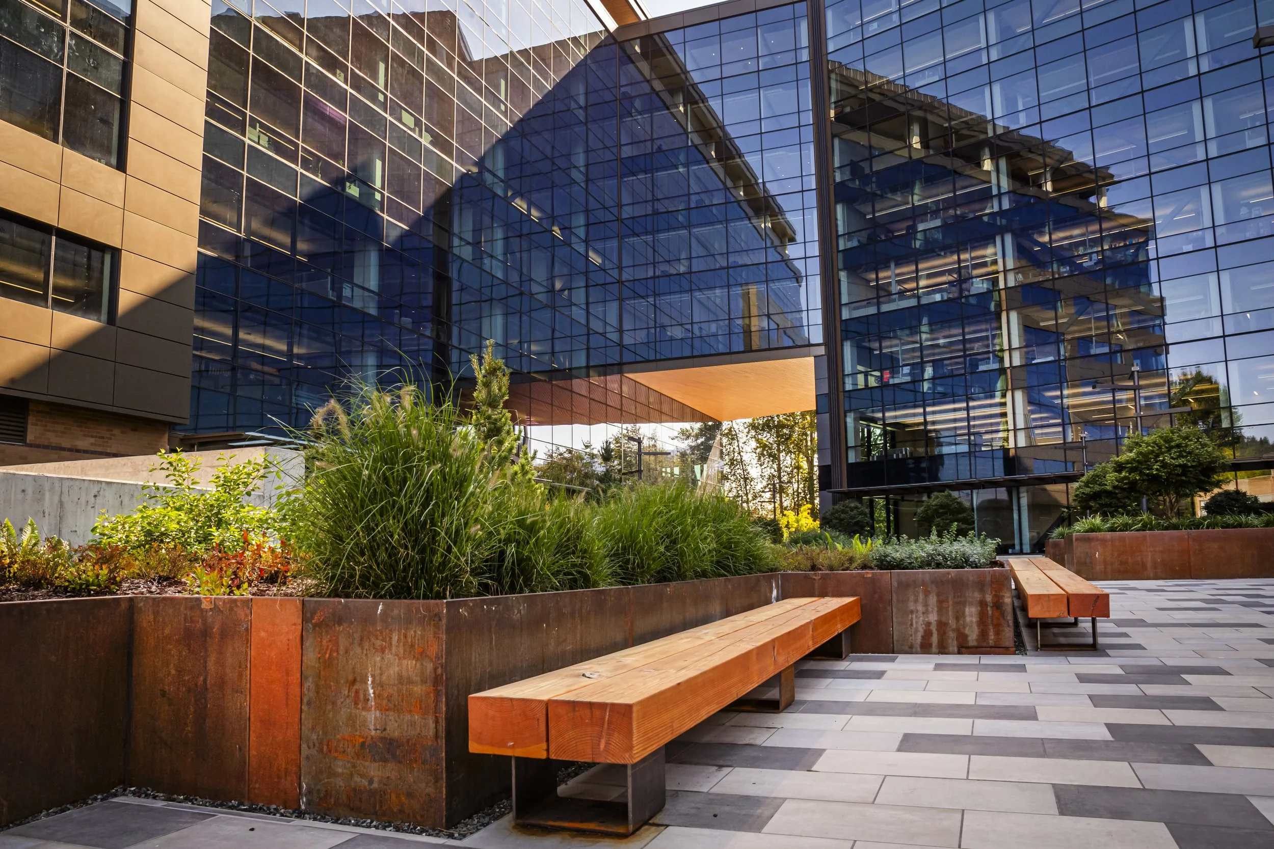 At Costco’s Corporate Campus, custom COR-TEN weathering steel planters were used to create a series of green spaces that encourage employee interaction and relaxation. The rectangular planters were integrated into the landscape design, establishing outdoor oases that enhance the campus's overall aesthetic while fostering a sense of well-being and connection.