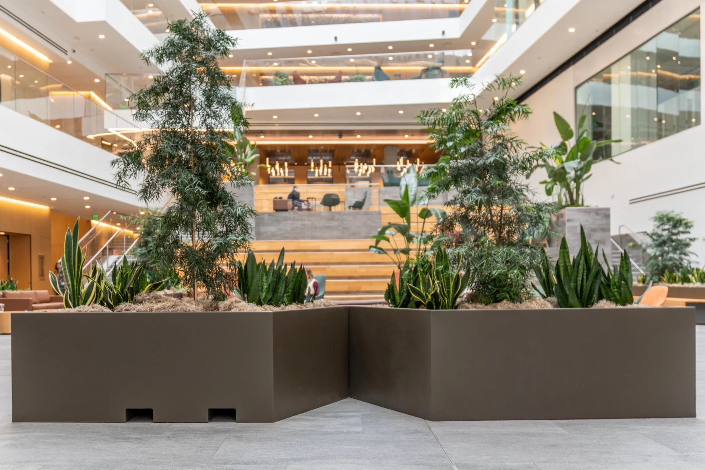 Biophilic Design for Well-Being – Large indoor planters introduce greenery that enhances mood, reduces stress, and creates a productive, inviting atmosphere in commercial spaces.