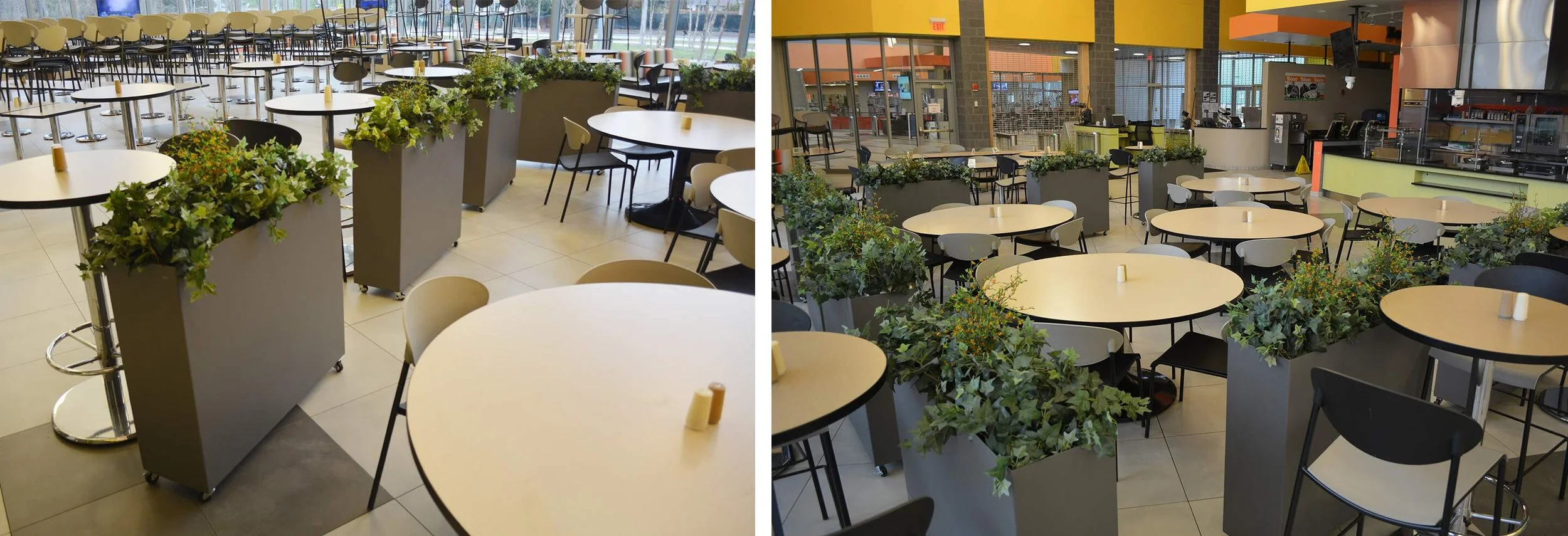 Enhance the energy of a new dining hall with pops of movable greenery while using long-lasting and modern planters.