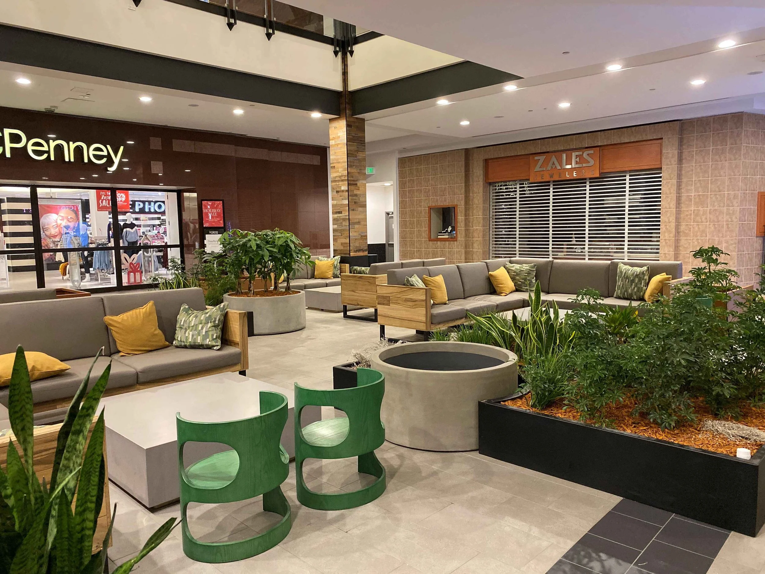 The combination of materials—from the sleek Matte Black and Weathered Rust finishes of the planters to the different textures of the benches and couches—creates a visually compelling environment that elevates the mall’s aesthetic, inviting visitors to sit, relax, and enjoy the unique setting.